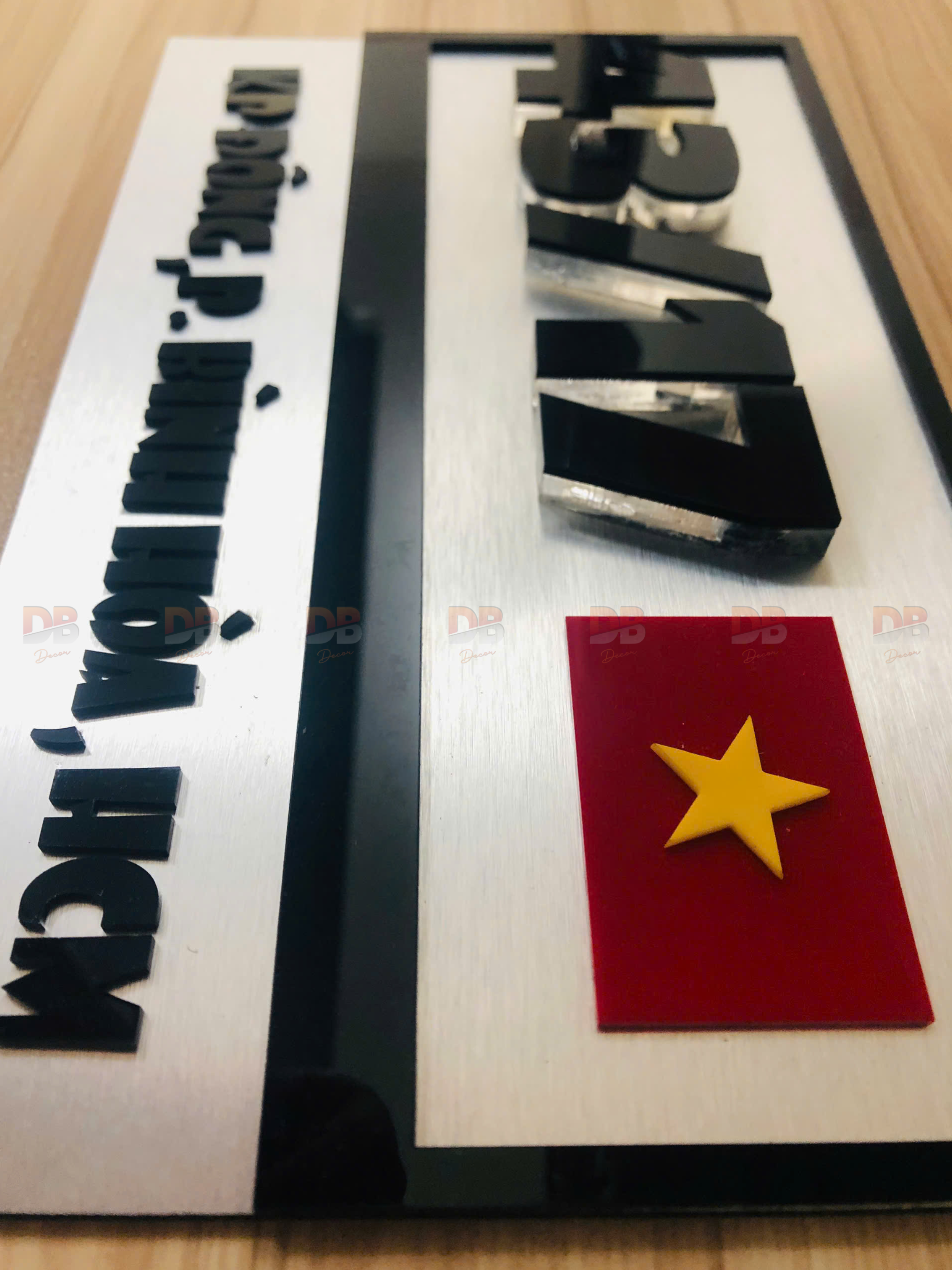 • Chữ nổi 3D: mica đen dày 2.5 mm, dán nổi trên nền, tạo chiều sâu mạnh và cảm giác cao cấp.