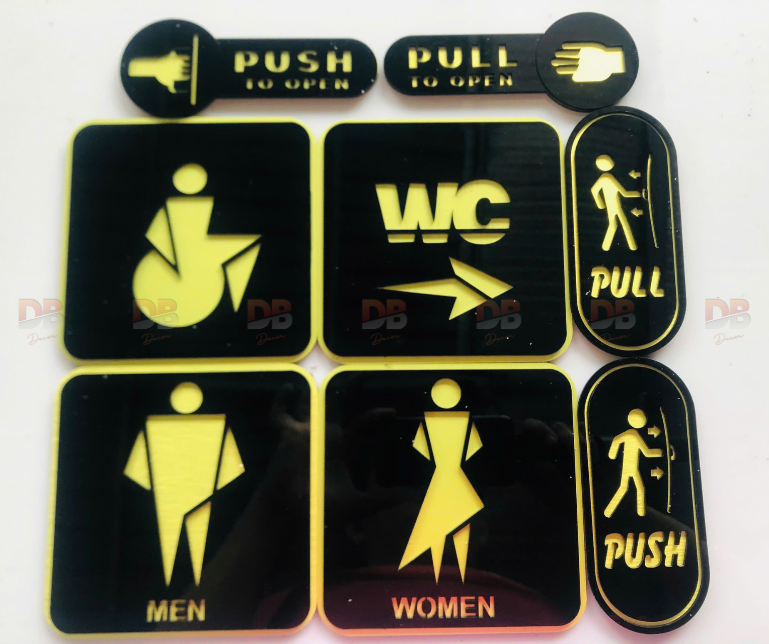 Bộ bảng được thiết kế cho nhà hàng, quán cà phê, khách sạn, văn phòng, phòng gym… gồm: Nam – Nữ – WC/Arrow –Push/Pull. Phong cách đen – vàng sang trọng, biểu tượng quốc tế dễ hiểu, nhìn rõ từ xa.