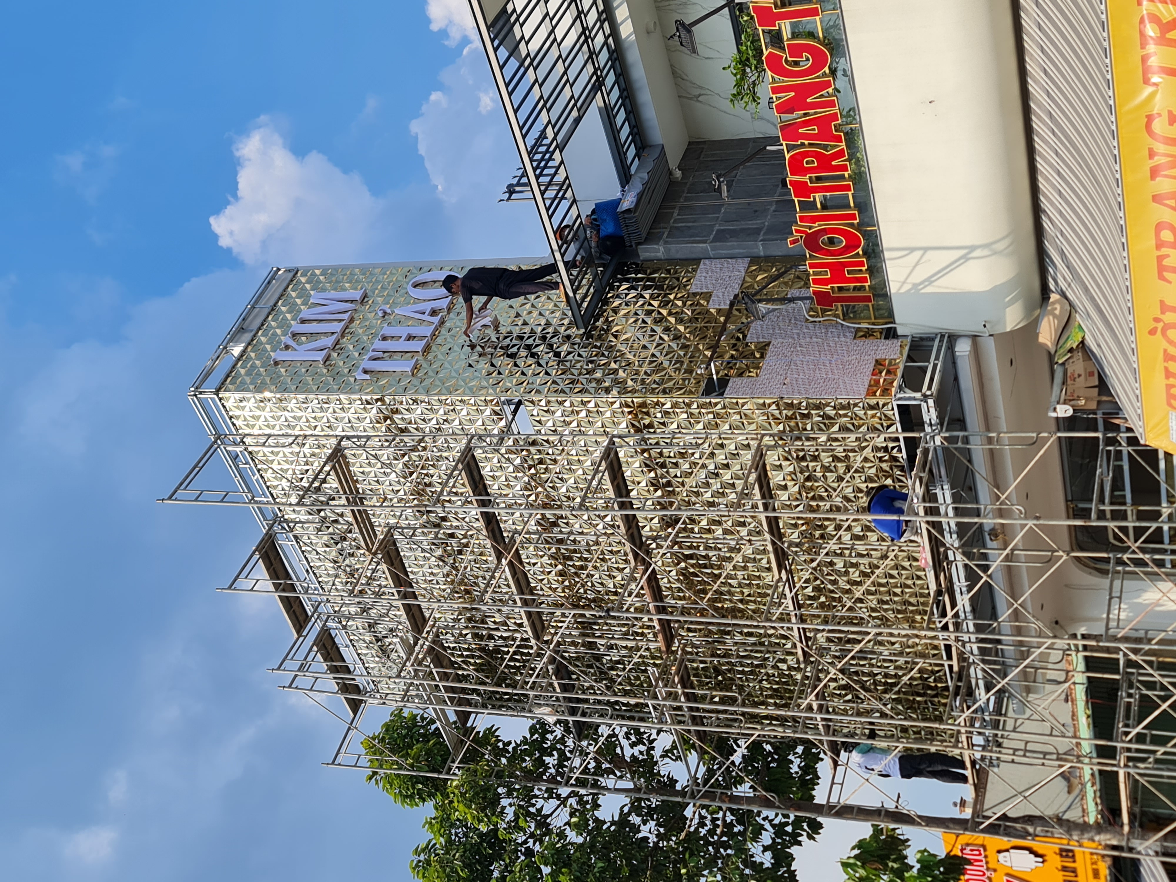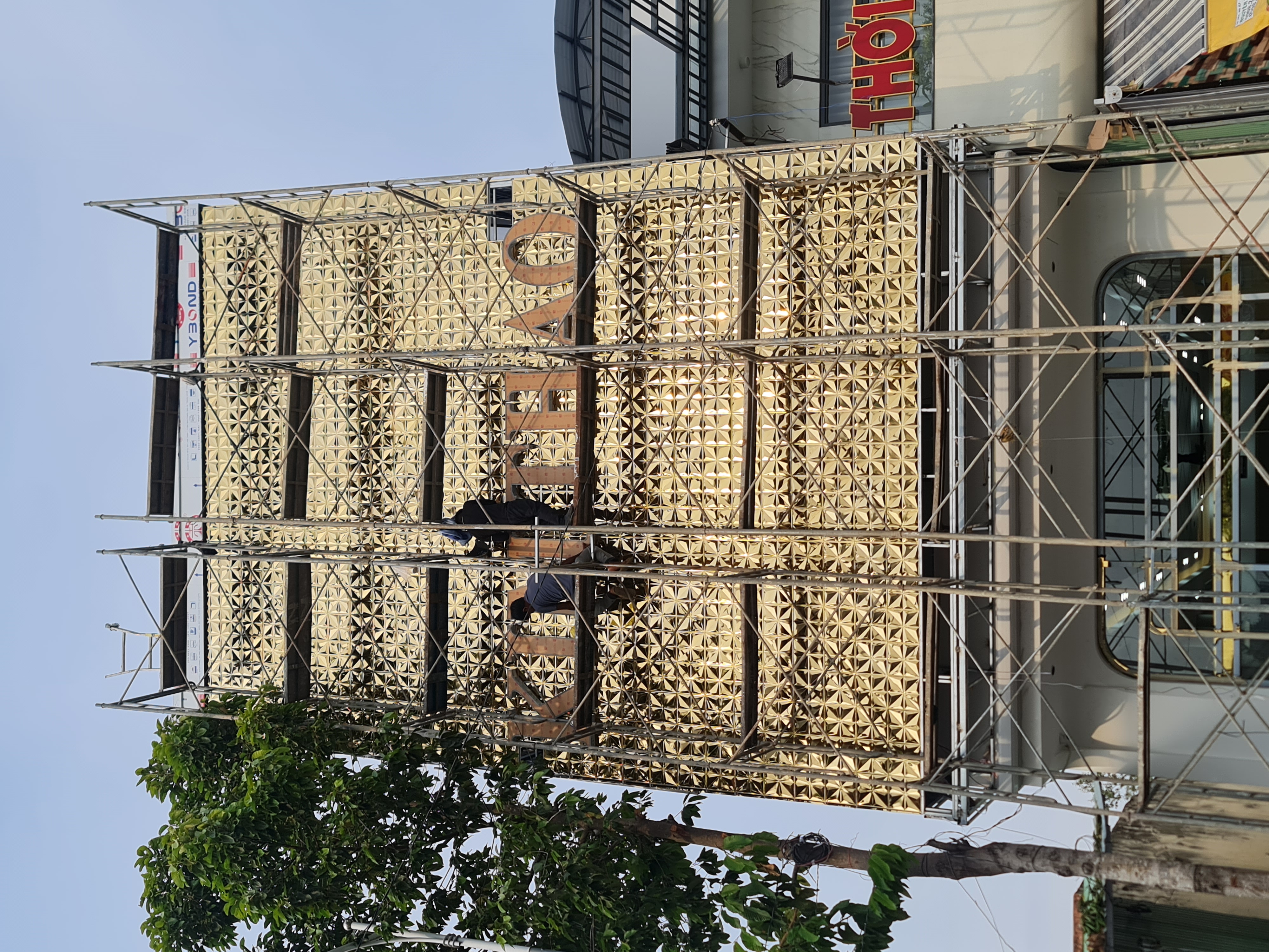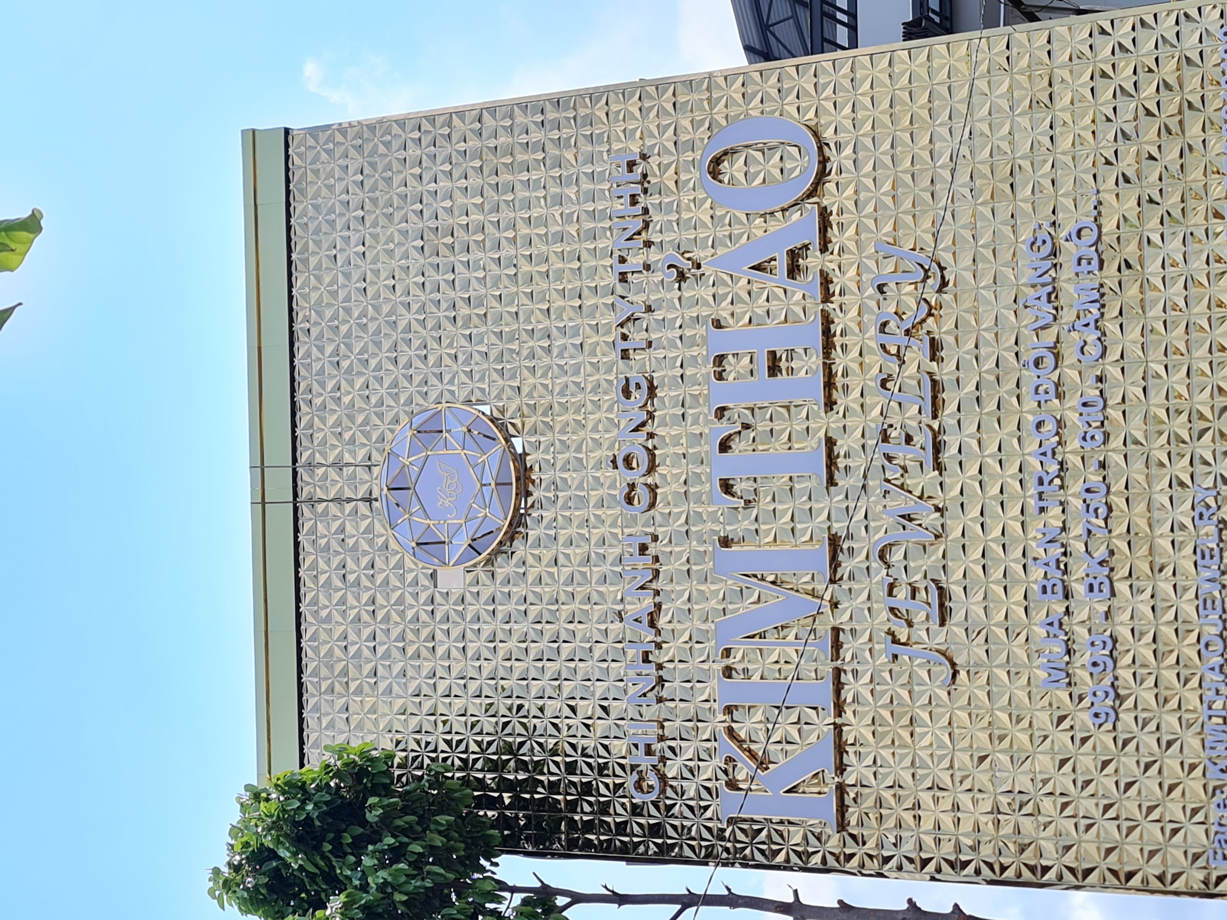 Chất liệu cao cấp: Toàn bộ mặt tiền được ốp tấm Alu gương vàng với họa tiết dập nổi hình thoi, tạo hiệu ứng phản chiếu đa chiều, giúp cửa hàng luôn lung linh bất kể ngày đêm.