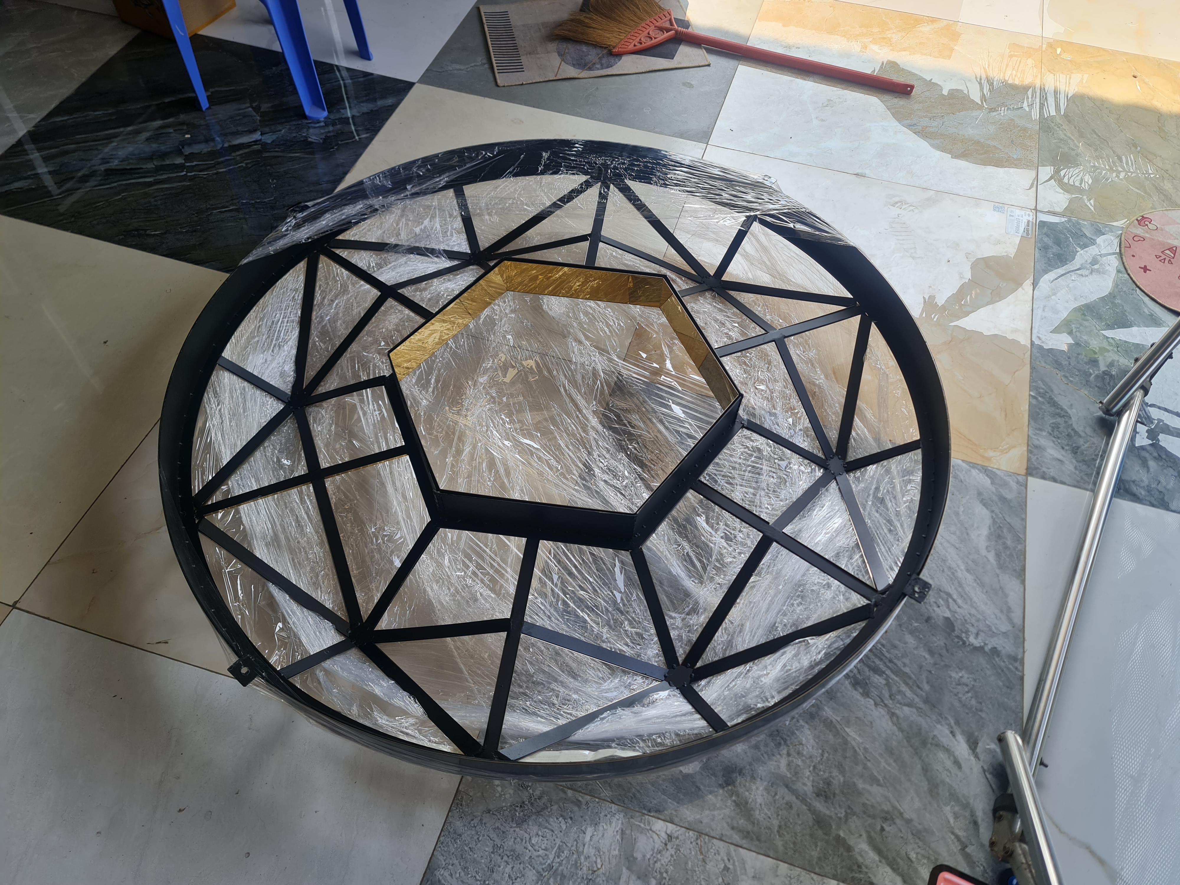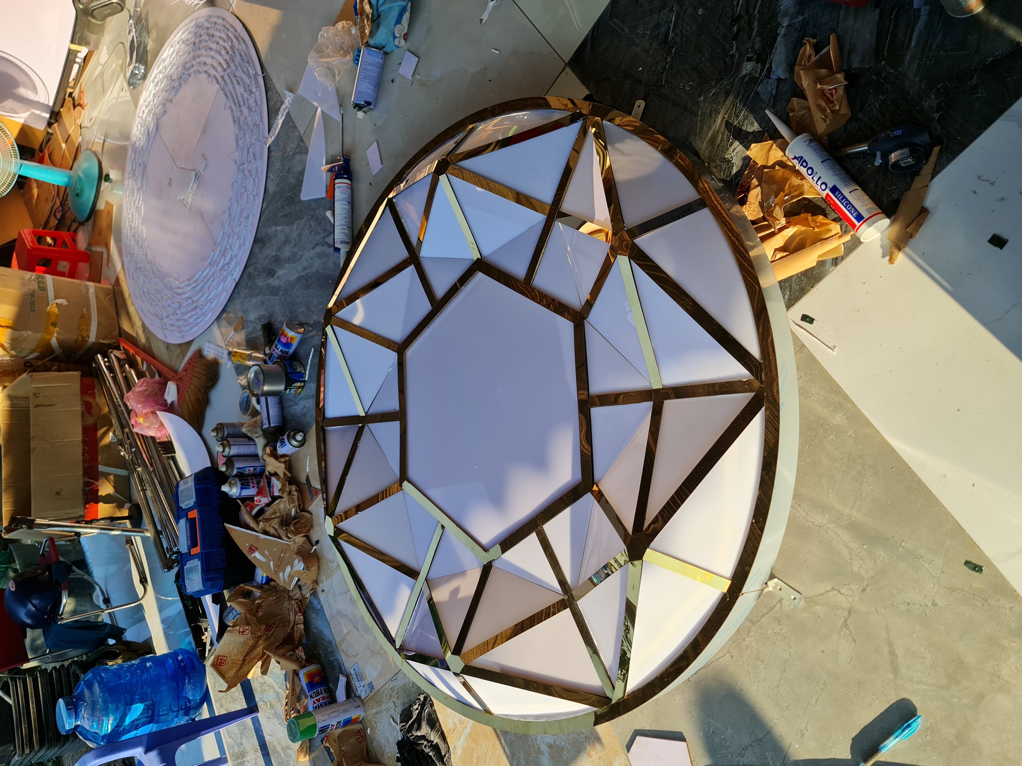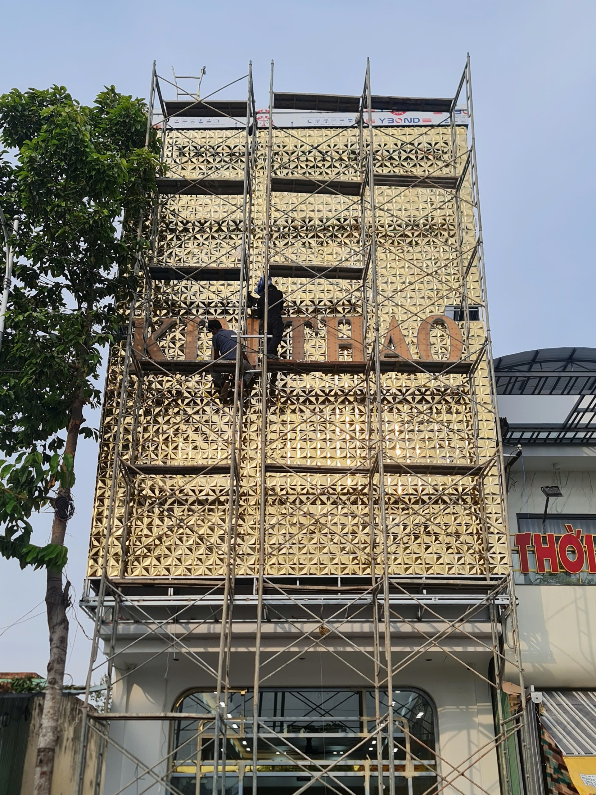 Chất liệu cao cấp: Toàn bộ mặt tiền được ốp tấm Alu gương vàng với họa tiết dập nổi hình thoi, tạo hiệu ứng phản chiếu đa chiều, giúp cửa hàng luôn lung linh bất kể ngày đêm.