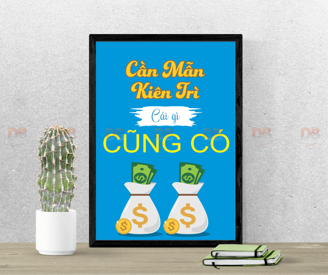 Bức tranh truyền cảm hứng nhắc nhở chúng ta rằng thành quả đến từ sự chăm chỉ và bền bỉ. Tông xanh tươi – vàng nổi bật cùng hình minh họa túi tiền/đồng xu tạo cảm giác tích cực, hợp treo tại văn phòng, cửa hàng, phòng kinh doanh, khu đào tạo, phòng gym hay góc học tập tại nhà.