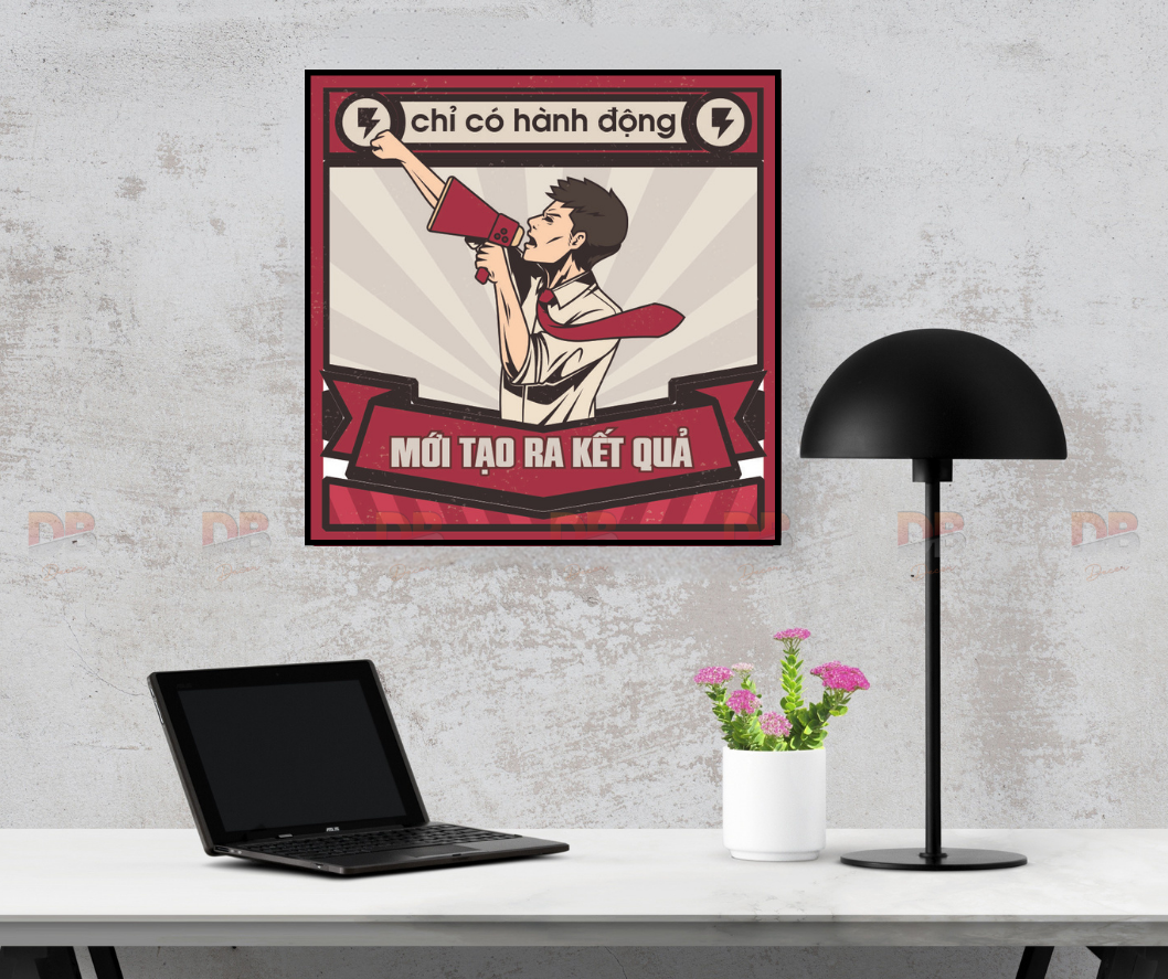 Bức tranh phong cách retro/vintage với gam đỏ – kem – đen nổi bật, nhân vật cầm loa và các tia tốc độ phía sau tạo cảm giác khẩn trương – quyết liệt. Treo trong văn phòng, khu sales, phòng họp, co-working, studio hay góc học tập để nhắc mình: Nói ít – làm nhiều, hành động ngay!