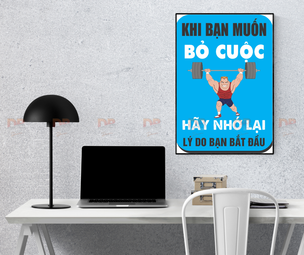 Bức tranh mang thông điệp mạnh mẽ dành cho phòng gym, góc tập tại nhà, văn phòng và lớp học kỹ năng. Hình minh họa vận động viên cử tạ cùng kiểu chữ to – rõ giúp truyền năng lượng tích cực, nhắc bạn kiên trì đến cùng mỗi khi nản chí.