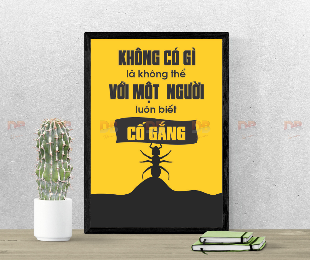 Hình tượng chú kiến kiên trì nâng tấm bảng “CỐ GẮNG” trên nền vàng – đen tương phản cao, tạo điểm nhấn mạnh mẽ cho bất kỳ không gian nào. Treo tại văn phòng, phòng họp, khu sales, lớp học, phòng gym… để nhắc mỗi người kiên định với mục tiêu.