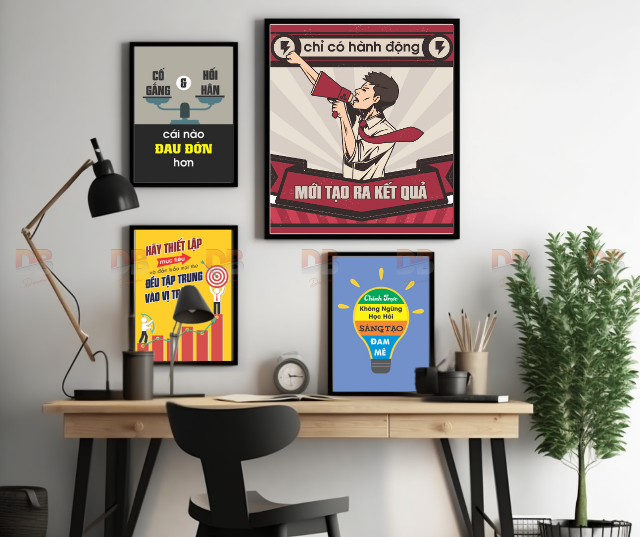 • Decal PP/PVC cán bóng hoặc mờ + khung nhôm/gỗ: gọn nhẹ, kinh tế.