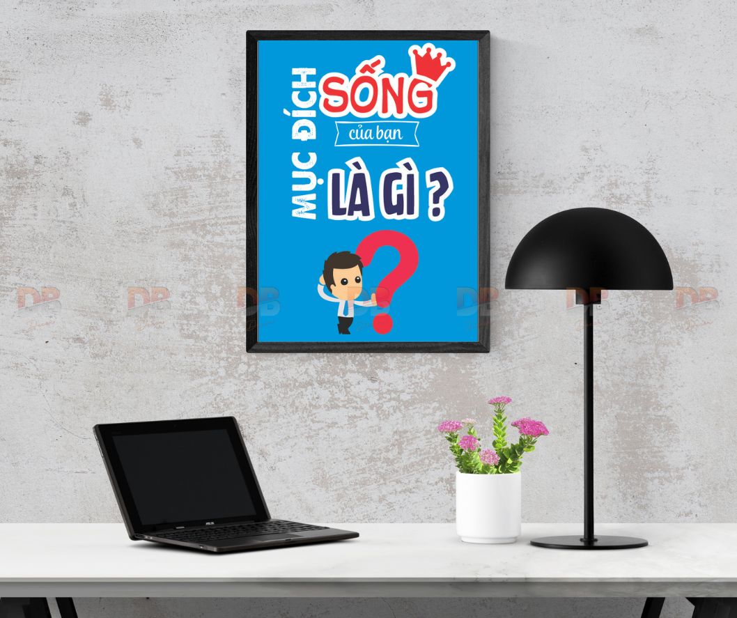Bức tranh truyền cảm hứng với sắc xanh tươi sáng, typography nổi bật và nhân vật minh hoạ dễ thương – nhắc ta mỗi ngày về câu hỏi quan trọng: Mục đích sống là gì? Rất hợp treo tại phòng làm việc, lớp học, phòng gym, góc học tập, trung tâm đào tạo…