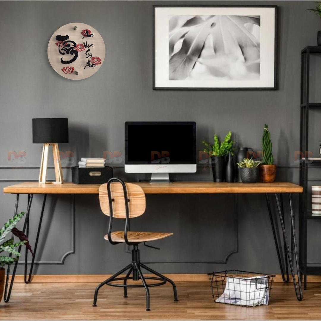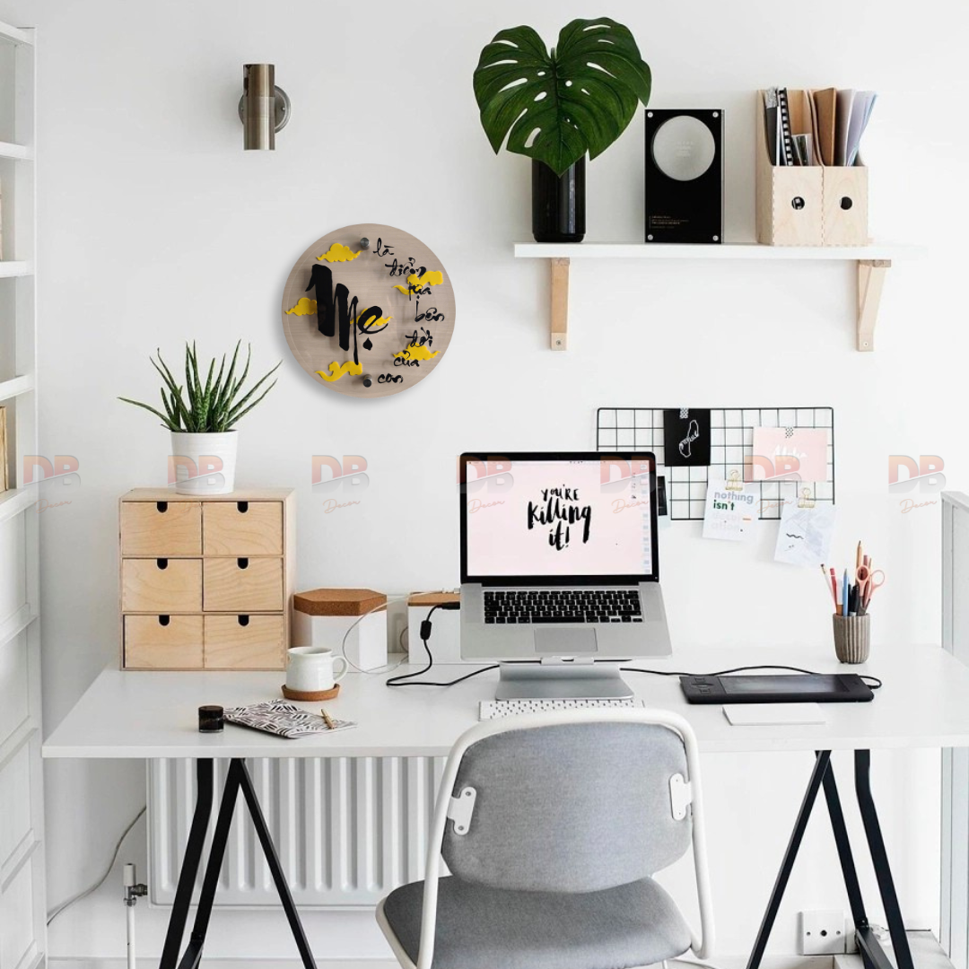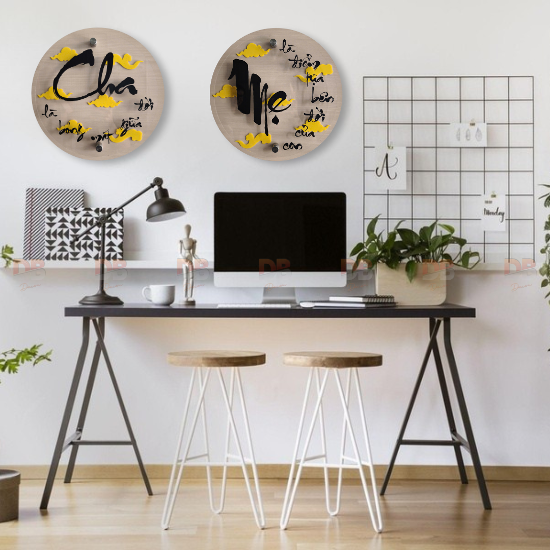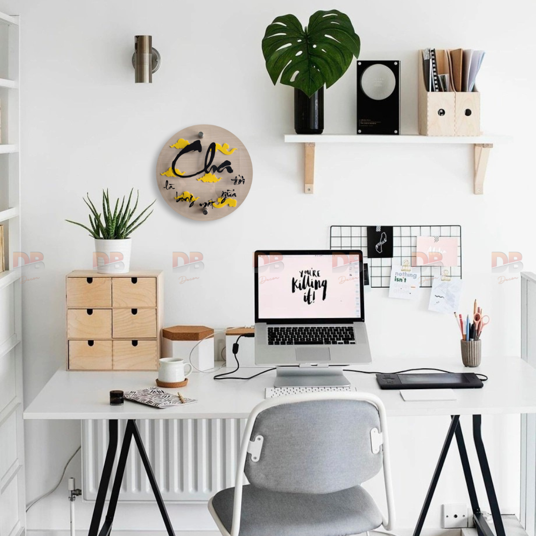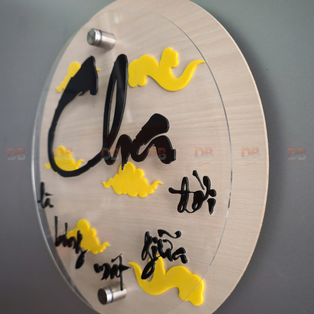 Tác phẩm thư pháp treo tường được phối 2–3 lớp: nền gỗ sang trọng, mica trong tạo chiều sâu và chữ mica đen nổi 3D khắc/cắt laser sắc nét. Điểm mây mica vàng làm nổi bật thông điệp — rất phù hợp làm quà tặng cho mẹ/cha, trang trí phòng khách, phòng làm việc, phòng thờ.
