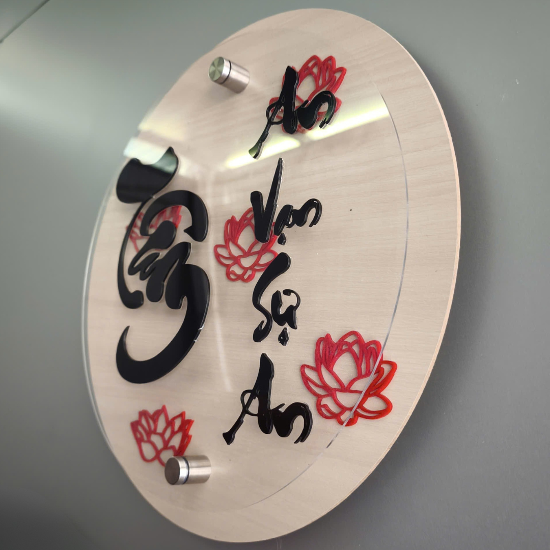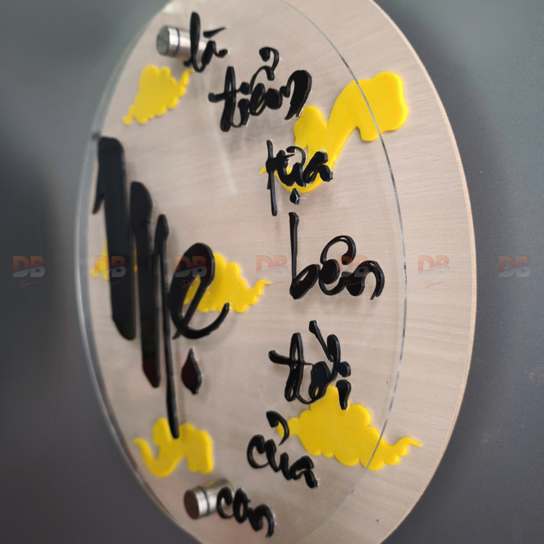 Tác phẩm thư pháp treo tường được phối 2–3 lớp: nền gỗ sang trọng, mica trong tạo chiều sâu và chữ mica đen nổi 3D khắc/cắt laser sắc nét. Điểm mây mica vàng làm nổi bật thông điệp — rất phù hợp làm quà tặng cho mẹ/cha, trang trí phòng khách, phòng làm việc, phòng thờ.