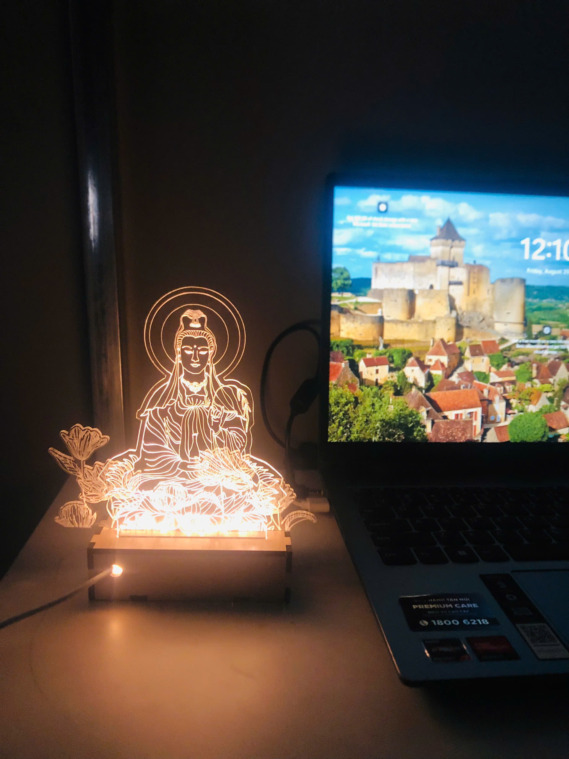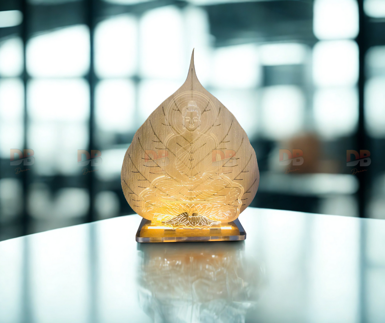 Mang năng lượng an yên vào không gian sống với tượng Phật khắc chìm trên mica, lá bồ đề khắc gân chìm lên gỗ. Từng đường nét được thể hiện tinh xảo, khi bật đèn LED, lớp khắc sáng lên dịu mắt, tạo cảm giác ấm áp và thanh tịnh.